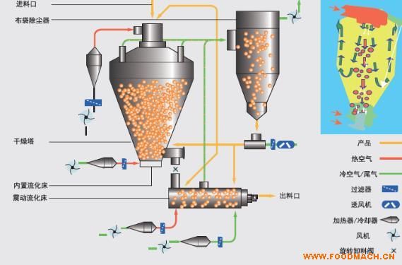 供應(yīng)染料頂出風(fēng)壓力噴霧干燥機(jī),流化床出口相連接的另一個(gè)外置流化床內(nèi)進(jìn)行。