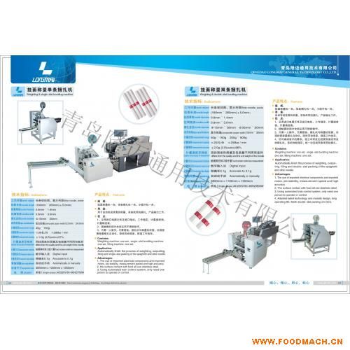掛面單條捆扎機只需一人操作,無需復(fù)驗。捆扎機與稱量機配套,實現(xiàn)掛面稱量捆自動化,降低勞動強度,提高工作效率。