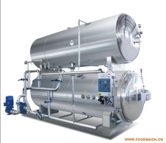 由上下兩個(gè)獨(dú)立罐體組成,上層為儲(chǔ)水罐(預(yù)熱和儲(chǔ)水),下層為殺菌罐。采用全水浸泡式殺菌,通過熱水循環(huán)加熱實(shí)現(xiàn)均勻滅菌。