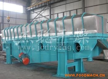 物料自進(jìn)料進(jìn)口進(jìn)入機(jī)內(nèi),在振動力作用下,物料沿水平面流化床拋擲,向前連續(xù)運(yùn)動,熱風(fēng)向上穿過流化床同濕物料換熱后,濕空氣經(jīng)旋風(fēng)分離器除塵后由排風(fēng)1:3排出.干燥物料由排料進(jìn)口排出。