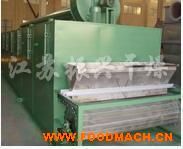 物料由加料器均勻地鋪在網(wǎng)帶上,網(wǎng)帶一般采用12-60目不銹鋼絲網(wǎng),由傳動裝置拖動在干燥機內(nèi)移動。干燥機由若干單元組成,每一單元熱風獨立循環(huán),部分尾氣由專門排濕風機排出,廢氣由調(diào)節(jié)閥控制,熱氣由下往上或由上往下穿過鋪滿物料的網(wǎng)帶完成熱量與質(zhì)量傳遞的進程,帶走物料水份。網(wǎng)帶緩慢移動,運行速度可根據(jù)物料溫度自由調(diào)節(jié),干燥后的成品連續(xù)落入收料器中。上下循環(huán)單元根據(jù)用戶需要可靈活配備,單元數(shù)量亦可根據(jù)需要選取。