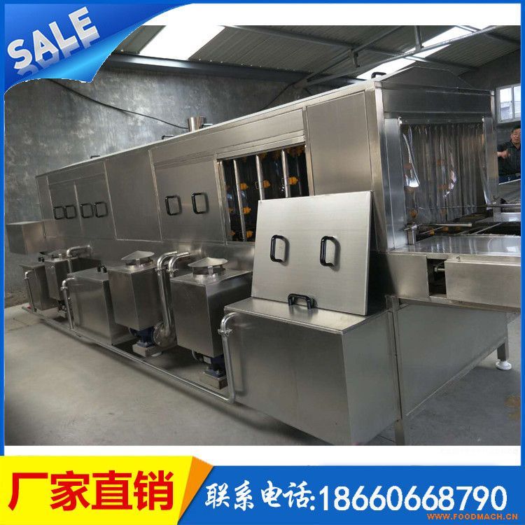 需清洗的周轉(zhuǎn)筐由不銹鋼鏈條輸入清洗機中,依次通過高溫老堿水→常溫自來水→消毒水等多道工序,將筐子清洗干凈,特殊筐子清洗時可在熱堿水清洗段后加配毛刷(該機沒有),對筐子底部及左右兩側(cè)進(jìn)行刷洗,提高清洗效果;采用連續(xù)式清洗,以提高清洗效率;