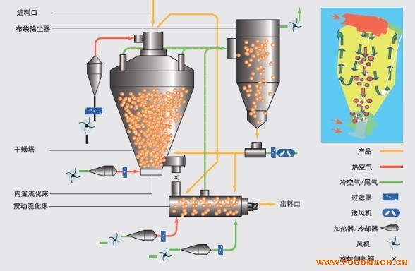 在顆粒進去流化床的同時,氣流反向向上運行,從干燥塔頂部被排出。