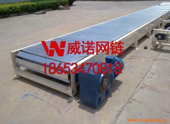 板鏈輸送機適用于形狀不規(guī)則物品的重載輸送。鏈條選用空心大輥子帶附件鏈條,在兩側同步鏈條的附件上用板狀構件連接使輸送方向形成連續(xù)的平板,因而運行平穩(wěn)。該機與鏈式或輥筒輸送機配合使用可實現(xiàn)轉角輸送。