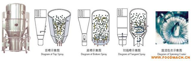 混合:對于可以流化的物料,如粉末、顆粒、微丸等都可在本設備中得到均勻混合,由于空氣的立體運動 (水平、射線和切線方向),混合效果非常優(yōu)越。