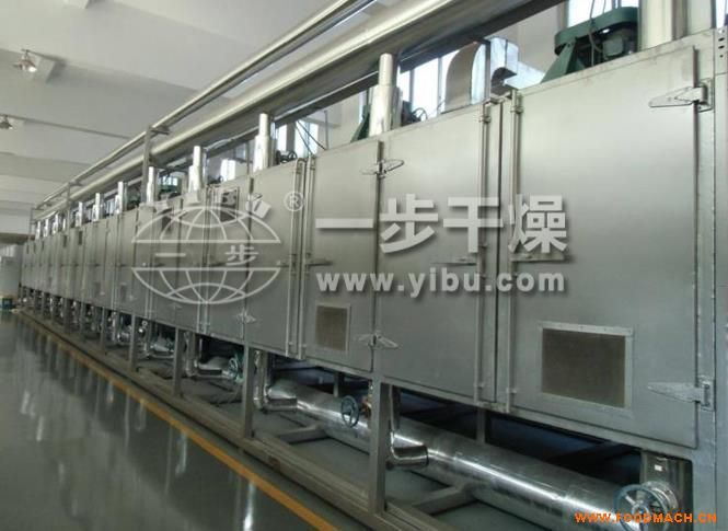 物料由加料器均勻地鋪在網(wǎng)帶上,網(wǎng)帶一般采用12-60目不銹鋼絲網(wǎng),由傳動裝置拖動在干燥機內(nèi)移動。干燥機由若干單元組成,每一單元熱風(fēng)獨立循環(huán),部分尾氣由專門排濕風(fēng)機排出,廢氣由調(diào)節(jié)閥控制,熱氣由下往上或由上往下穿過鋪滿物料的網(wǎng)帶完成熱量與質(zhì)量傳遞的進程,帶走物料水份。網(wǎng)帶緩慢移動,運行速度可根據(jù)物料溫度自由調(diào)節(jié),干燥后的成品連續(xù)落入收料器中。上下循環(huán)單元根據(jù)用戶需要可靈活配備,單元數(shù)量亦可根據(jù)需要選取。