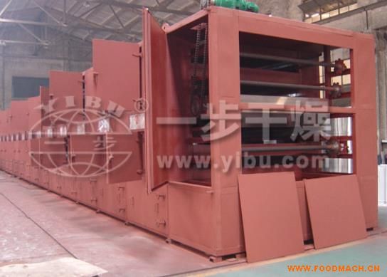 物料由加料器均勻地鋪在網(wǎng)帶上,網(wǎng)帶一般采用12-60目不銹鋼絲網(wǎng),由傳動裝置拖動在干燥機內(nèi)移動。干燥機由若干單元組成,每一單元熱風獨立循環(huán),部分尾氣由專門排濕風機排出,廢氣由調(diào)節(jié)閥控制,熱氣由下往上或由上往下穿過鋪滿物料的網(wǎng)帶完成熱量與質(zhì)量傳遞的進程,帶走物料水份。網(wǎng)帶緩慢移動,運行速度可根據(jù)物料溫度自由調(diào)節(jié),干燥后的成品連續(xù)落入收料器中。上下循環(huán)單元根據(jù)用戶需要可靈活配備,單元數(shù)量亦可根據(jù)需要選取。