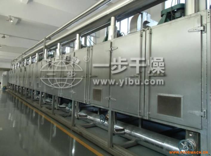 物料由加料器均勻地鋪在網(wǎng)帶上,網(wǎng)帶一般采用12-60目不銹鋼絲網(wǎng),由傳動裝置拖動在干燥機內(nèi)移動。干燥機由若干單元組成,每一單元熱風(fēng)獨立循環(huán),部分尾氣由專門排濕風(fēng)機排出,廢氣由調(diào)節(jié)閥控制,熱氣由下往上或由上往下穿過鋪滿物料的網(wǎng)帶完成熱量與質(zhì)量傳遞的進程,帶走物料水份。網(wǎng)帶緩慢移動,運行速度可根據(jù)物料溫度自由調(diào)節(jié),干燥后的成品連續(xù)落入收料器中。上下循環(huán)單元根據(jù)用戶需要可靈活配備,單元數(shù)量亦可根據(jù)需要選取。