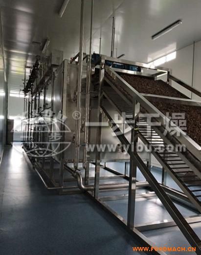 物料由加料器均勻地鋪在網(wǎng)帶上,網(wǎng)帶一般采用12-60目不銹鋼絲網(wǎng),由傳動裝置拖動在干燥機(jī)內(nèi)移動。干燥機(jī)由若干單元組成,每一單元熱風(fēng)獨(dú)立循環(huán),部分尾氣由專門排濕風(fēng)機(jī)排出,廢氣由調(diào)節(jié)閥控制,熱氣由下往上或由上往下穿過鋪滿物料的網(wǎng)帶完成熱量與質(zhì)量傳遞的進(jìn)程,帶走物料水份。網(wǎng)帶緩慢移動,運(yùn)行速度可根據(jù)物料溫度自由調(diào)節(jié),干燥后的成品連續(xù)落入收料器中。上下循環(huán)單元根據(jù)用戶需要可靈活配備,單元數(shù)量亦可根據(jù)需要選取。