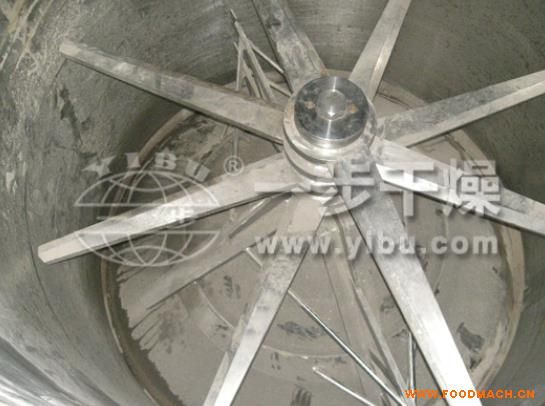 熱空氣切線進(jìn)入干燥器底部,在攪拌器帶動(dòng)下形成強(qiáng)有力的旋轉(zhuǎn)風(fēng)場。膏狀物料由螺旋加料器進(jìn)入干燥器內(nèi),在高速旋轉(zhuǎn)攪拌槳的強(qiáng)烈作用下,物料受撞擊、磨擦及剪切力的作用下得到分散,塊狀物料迅速粉碎,與熱空氣充分接觸、受熱、干燥。脫水后的干物料隨熱氣流上升,分級(jí)環(huán)將大顆粒截留,小顆粒從環(huán)中心排出干燥器外,由旋風(fēng)分離器和除塵器回收,未干透或大塊物料受離心力作用甩向器壁,重新落到底部被粉碎干燥。