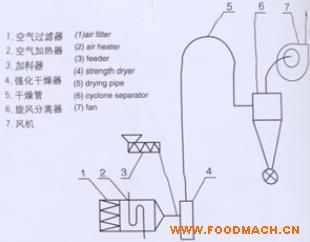 氣流干燥能從易于脫水的顆粒,粉末狀物料,迅速除去水分(主要是表面水份).在氣流干燥中,由于物料在干燥器內(nèi)停留時間短,使干燥成品的品質(zhì)得到理想的控制.我廠強化型氣流干燥是在基本型上增加一套轉(zhuǎn)速可以無級調(diào)節(jié)的強化器組成,濕物料通過螺旋加料器進(jìn)入強化器后和熱氣流充分混合,在飛速旋轉(zhuǎn)的擊刀擊碎和推進(jìn)下,物料被破碎成細(xì)顆粒,在干燥同時向出口移動,^后在風(fēng)力吸引下進(jìn)入干燥管,進(jìn)一步均勻干燥.風(fēng)力無法吸引的濕重顆粒繼續(xù)被擊碎、干燥、直至能被風(fēng)吸起進(jìn)入干燥管。