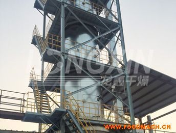 離心噴霧干燥機(jī)主要是物料通過高速旋轉(zhuǎn)的霧化器的離心力將物料分配成霧滴狀,與通過蝸殼熱風(fēng)分配器的熱風(fēng)相接觸后瞬間干燥。由于料液在高速轉(zhuǎn)盤(線速度在110m/s以上)中受離心力作用從盤邊緣甩出而霧化,料液霧化的直徑比較大,因此干燥塔需要較大的直徑。同時(shí)由于物料是被離心力甩出來,霧滴的相對大小比較均勻,霧滴與熱風(fēng)接觸的瞬間被干燥,霧滴干燥成基本都是空心粉體,物料的顆粒度比較均勻,但物料的顆粒度相對較小。