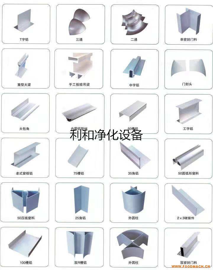 凈化工程配套的系列鋁合金型材:分別有銀白型、電泳型、噴塑型等。具體規(guī)格有槽鋁,內(nèi)圓弧鋁(PVC塑料底座),外圓弧鋁,門框鋁,圓弧形、斜壓線窗框鋁,單、雙R槽鋁,工字鋁,T形鋁,H鋁,角鋁,門堵頭,內(nèi)外三通等。
