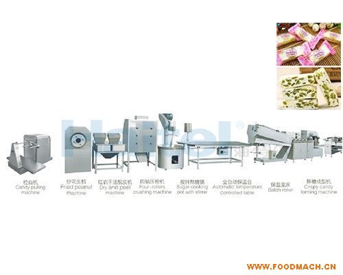 化糖 →糖漿輸送→ 真空連續(xù)熬煮→糖漿冷卻成糖膏 → 糖膏揉捏→拉白→炒花生→ 脫皮→ 壓粉 → 攪拌熬糖 → 保溫裹衣→糖衣滾動(dòng)→拉成糖條→糖條經(jīng)過(guò)沖壓成形→酥糖輸出冷卻 → 包裝成品