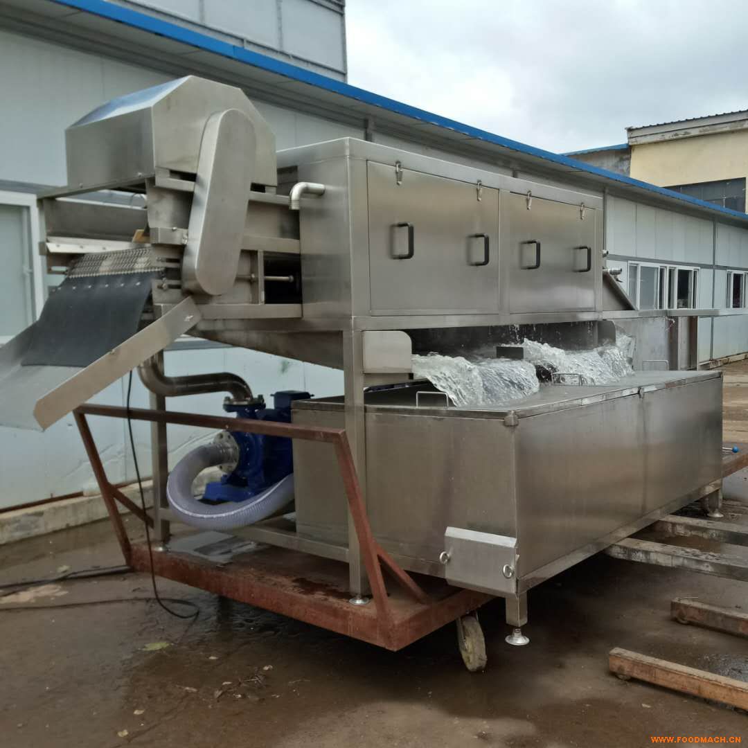 大姜進入水槽,進入氣泡清洗裝置,在氣泡裝置水流下大姜被充分打散、翻滾、清洗、網(wǎng)帶傳送,從物料表面洗脫的泥沙沉入底部隔離倉,不會發(fā)生翻揚回流造成的再度污染。大姜進入高壓噴淋裝置,漂浮在水中的雜物、小蟲通過去雜機構(gòu)清理掉,洗凈的大姜由出水口再經(jīng)噴淋清洗送至下道工序。該清洗機能有效去除大姜表面的污染物、以及農(nóng)藥,且對大姜無損傷。有效的清除蔬菜表面的污染物而且可以縮短清洗時間,省時、省力、省水、洗潔凈高、提高生產(chǎn)效率。