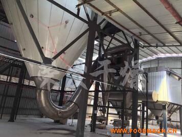 空氣經(jīng)過濾和加熱,進(jìn)入干燥器頂部空氣分配器,熱空氣呈螺旋狀均勻地進(jìn)入干燥室。料液經(jīng)塔體頂部的高速離心霧化器,(旋轉(zhuǎn))噴霧成極細(xì)微的霧狀液珠,與熱空氣并流接觸在極短的時(shí)間內(nèi)可干燥為成品。成品連續(xù)地由干燥塔底部和旋風(fēng)分離器中輸出,廢氣由風(fēng)機(jī)排空。