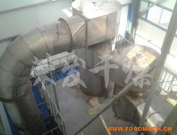 空氣經(jīng)過(guò)濾和加熱,進(jìn)入干燥器頂部空氣分配器,熱空氣呈螺旋狀均勻地進(jìn)入干燥室。料液經(jīng)塔體頂部的高速離心霧化器,(旋轉(zhuǎn))噴霧成極細(xì)微的霧狀液珠,與熱空氣并流接觸在極短的時(shí)間內(nèi)可干燥為成品。成品連續(xù)地由干燥塔底部和旋風(fēng)分離器中輸出,廢氣由風(fēng)機(jī)排空。
