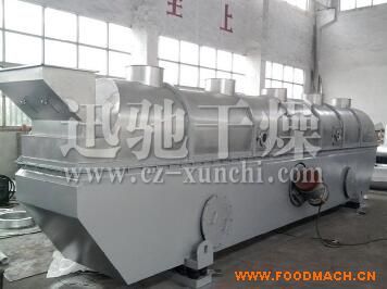 物料自進(jìn)料進(jìn)口進(jìn)入機(jī)內(nèi),在振動力作用下,物料沿水平面流化床拋擲,向前連續(xù)運(yùn)動,熱風(fēng)向上穿過流化床同濕物料換熱后,濕空氣經(jīng)旋風(fēng)分離器除塵后由排風(fēng)1:3排出.干燥物料由排料進(jìn)口排出。