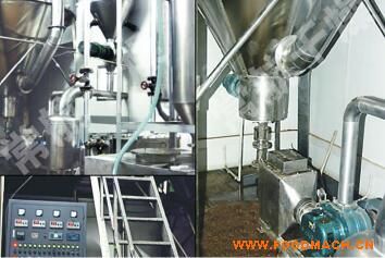 該機采用全封閉形式,所有部件均采用不銹鋼制造,配有三級凈化裝置,過濾后的空氣達十萬級要求。筒體與頂部裝有冷壁裝置,使壁溫<80℃,干燥塔內裝有氣刷掃塔裝置。經該機干燥后的中藥浸膏粉,不會出現(xiàn)焦化變質現(xiàn)象,大大增加了收粉率(95%以上),而且不會產生混藥現(xiàn)象和粘壁現(xiàn)象。