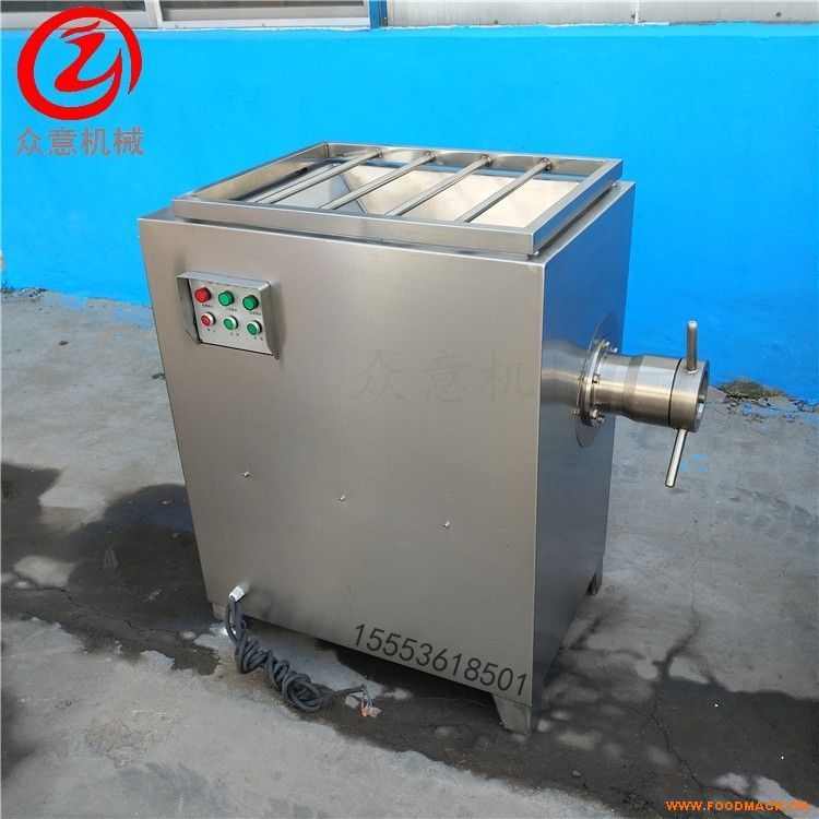 凍肉絞肉機是肉制品生產(chǎn)行業(yè)中通用性高使用范圍廣的一種肉食加工設備。它是依靠螺桿將料斗中的原料肉推到預切切板處,通過螺桿的旋轉擠壓使孔板與絞刀產(chǎn)生相對運轉,從而將原料肉切成顆粒形狀,確保了肉餡的均勻性。通過也板的不同組合可達到理想要求的不同肉餡。