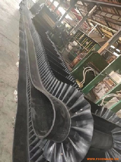 大傾角環(huán)形擋邊帶, 是由基帶、擋邊、橫隔板3部分組成。擋邊起防止物料測滑撒落的作用。為便于繞過滾筒,檔邊設(shè)計(jì)成波紋狀;橫隔板的作用是承托物料,為了實(shí)現(xiàn)大傾角輸送,采用T型TC型。檔邊和橫隔板是用二次硫化的方法與基帶連接的,具有很高的連接強(qiáng)度。用于輸送易散落的粉狀、粒狀、小塊狀、糊狀及液態(tài)狀物料。其特點(diǎn):適用于傾角0°~90°散裝物料的輸送;具有使用范圍廣、占地面積小、無轉(zhuǎn)運(yùn)點(diǎn)、減少土建投資、維護(hù)費(fèi)用低、維修容易輸送量大連續(xù)化、高效率、大傾角運(yùn)輸,操作安全,使用簡便,,運(yùn)費(fèi)低廉,并能縮短運(yùn)輸距離,降低工程造價(jià),節(jié)省人力物力等特點(diǎn);解決了普通帶和花紋帶所不能達(dá)到的輸送角度;還可根據(jù)使用環(huán)境,設(shè)計(jì)成完整、獨(dú)立的輸送系統(tǒng),避免了間斷輸送和復(fù)雜輸送的提升系統(tǒng)?裳厮、傾斜、垂直和變角方向輸送各種散裝物料,從煤、礦石、沙子到化肥和糧食等。物料粒度不限,可從很小的粒度到400mm的大粒度,輸送量可從1立方米/小時(shí)到6000立方米/小時(shí)。