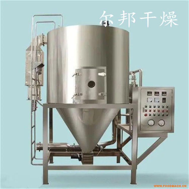 空氣經(jīng)過濾和加熱,進(jìn)入干燥器頂部空氣分配器,熱空氣呈螺旋狀均勻地進(jìn)入干燥室,料液經(jīng)塔體頂部的高速離心霧化器,旋轉(zhuǎn)噴霧成極細(xì)微的霧狀液珠,與熱空氣并流接觸在極短的時間內(nèi)可干燥為成品,成品連續(xù)地由干燥塔底部和旋風(fēng)分離器中輸出,廢氣由引風(fēng)機(jī)排空。干燥速度快,料液經(jīng)霧化后表面積大大增加,完成干燥的時間僅需要十幾秒到數(shù)十秒種,特別適用于熱敏性物料的干燥。所有產(chǎn)品為球狀顆粒,粒度均勻,流動性好,溶解性好,產(chǎn)品純度高,質(zhì)量好。