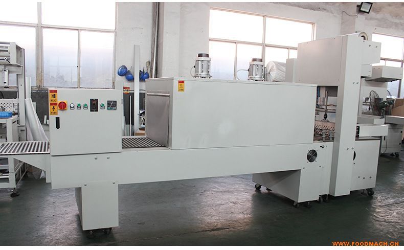 需包裝的瓶或盒,按包裝規(guī)格要求,人工擺放到推瓶撥叉之間的推瓶平臺上,以推瓶板為后基準(zhǔn),兩撥叉為左右基準(zhǔn)。放妥后手離開推瓶板運動區(qū)間,按動啟動按鈕,推瓶機構(gòu)自動推瓶過封切線,停留,待壓瓶機構(gòu)動作壓住瓶頭后推瓶氣缸后撤回到原位,讓出擺瓶空間繼續(xù)下一包擺瓶。同時封切機構(gòu)開始動作,壓膜氣缸向下動作,壓住薄膜,然后熱封切刀向上動作,完成封切功能后所有氣缸回原位。人工繼續(xù)擺放下一包包裝物,擺放好后啟動按鈕,待第二包推過封切線時同時把*包已封切好的包裝物推到熱收縮機輸送網(wǎng)帶上,網(wǎng)帶帶動包裝物進(jìn)入收縮烘道,在烘道內(nèi),不斷循環(huán)的熱風(fēng)吹到包裝物表面的薄膜上,使薄膜自然貼和到包裝物上,完成烘道收縮過程,包裝物離開熱風(fēng)烘道進(jìn)入冷卻通道,在冷卻風(fēng)機的作用下冷卻到室溫后輸送到臨時載貨架上。注意人工搬下架只能在臨時載貨架尾端進(jìn)行,保證包裝膜充分冷卻。上述過程連續(xù)重復(fù)進(jìn)行就實現(xiàn)了包裝半自動化。
