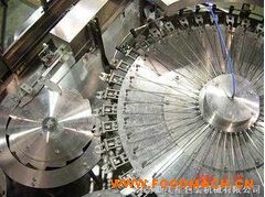 瓶子通過空氣輸送道由撥瓶星輪傳送至三合一機的沖瓶機。沖瓶機回轉(zhuǎn)盤上裝有瓶夾,瓶夾夾住瓶口沿一導軌翻轉(zhuǎn)180°,使瓶口向下。在沖瓶機特定區(qū)域,瓶夾上的噴嘴噴出沖瓶水,對瓶子內(nèi)壁進行沖洗。瓶子經(jīng)沖洗、瀝干后在瓶夾夾持下沿導軌再翻轉(zhuǎn)180°,使瓶口向上。洗凈后的瓶子通過撥瓶星輪由沖瓶機導出并傳送至灌裝機。進入灌裝機的瓶子由瓶頸托板卡住瓶口保持。灌裝閥通過閥升降機構(gòu)在凸輪作用下實現(xiàn)下降與上升。灌裝采用壓力灌裝方式。灌裝閥下降接觸瓶口后打開完成灌裝過程,灌裝結(jié)束后灌裝閥上升離開瓶口,瓶子通過卡瓶頸過渡撥輪進入旋蓋機。旋蓋機上的止旋刀卡住瓶頸部位,保持瓶子直立并防止旋轉(zhuǎn)。旋蓋頭在旋蓋機上保持公轉(zhuǎn)并自轉(zhuǎn),在凸輪作用下實現(xiàn)抓蓋、套蓋、旋蓋、脫蓋動作,完成整個封蓋過程。成品瓶通過出瓶撥輪從旋蓋機傳送到出瓶輸送鏈上,由輸送鏈傳送出三合一機。