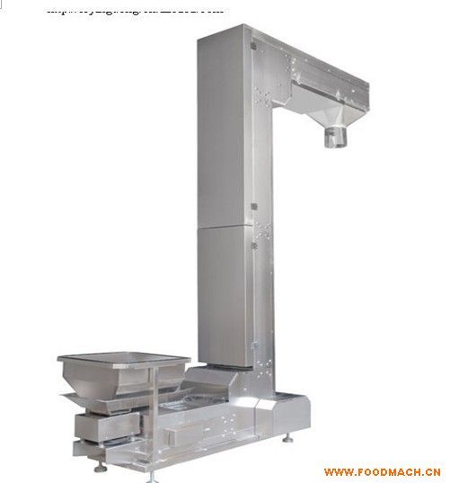 材料經(jīng)振動(dòng)落入運(yùn)轉(zhuǎn)中的料斗,往上提升后到達(dá)出口時(shí)利用產(chǎn)品的重力出料。