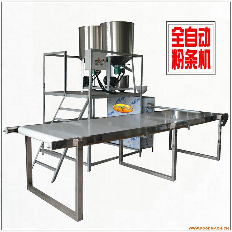 全自動免凍無礬粉條機由循環(huán)攪漿系統(tǒng)、自熟漏粉系統(tǒng)、調(diào)速接條系統(tǒng)和動力系統(tǒng)組成,簡化了傳統(tǒng)漏粉的繁瑣工藝,是對傳統(tǒng)工藝漏粉的顛復性升級,它采用無煙、無礬、無膠、無需打芡、無需冷凍分條等先進的生產(chǎn)工藝,一條龍作業(yè),自動完成攪漿、煮漿熟化,漏粉,接條輸送等工藝流程,所生產(chǎn)的粉條粉絲條直透明,口感細膩,勁道耐煮,不化條,不酥條,不混湯,解決了過去依靠人工完成的生產(chǎn)環(huán)節(jié),節(jié)省了人工,減輕了勞動力,使之實現(xiàn)了生產(chǎn)連續(xù)化、機械化,大大縮減了生產(chǎn)周期。