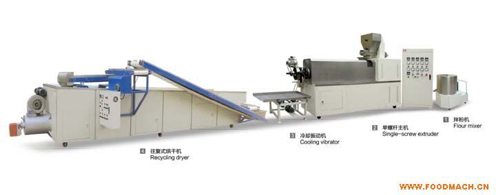 該生產(chǎn)線以米粉為主要原料,可根據(jù)需要選擇性填充多種維生素和礦物質(zhì),經(jīng)單螺桿擠壓膨化機(jī)擠出米粒形狀,再烘干至要求水分,水煮5~8分鐘即可食用。擠壓膨化米生產(chǎn)技術(shù)使大米中的微量營(yíng)養(yǎng)素的強(qiáng)化成為可能,營(yíng)養(yǎng)素被固化在米粒當(dāng)中而不易流失。