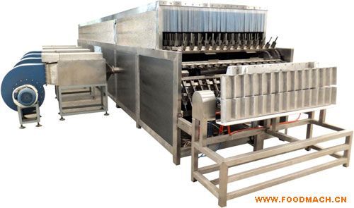 空玻璃瓶經(jīng)手工放置到輸送帶卡座上后,經(jīng)輸送帶送到?jīng)_淋區(qū)進行1次、2次噴淋沖洗,同時進行外瓶沖洗,然后進入烘干區(qū)進行烘干滅菌,送至翻瓶區(qū)后自動翻轉(zhuǎn)落至理瓶機上,經(jīng)灌裝輸送帶,轉(zhuǎn)至下道灌裝等程序。
