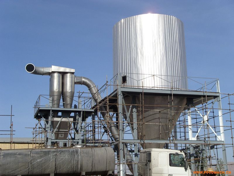 空氣經(jīng)過濾和加熱,進(jìn)入干燥器頂部空氣分配器,熱空氣呈螺旋狀均勻地進(jìn)入干燥室。料液經(jīng)塔體頂部的高速離心霧化器,(旋轉(zhuǎn))噴霧成極細(xì)微的霧狀液珠,與熱空氣并流接觸在極短的時(shí)間內(nèi)可干燥為成品。成品連續(xù)地由干燥塔底部和旋風(fēng)分離器中輸出,廢氣由風(fēng)機(jī)排空。