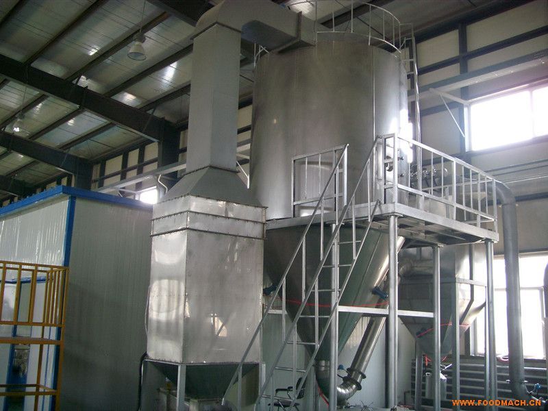 空氣經(jīng)過濾和加熱,進(jìn)入干燥器頂部空氣分配器,熱空氣呈螺旋狀均勻地進(jìn)入干燥室。料液經(jīng)塔體頂部的高速離心霧化器,(旋轉(zhuǎn))噴霧成極細(xì)微的霧狀液珠,與熱空氣并流接觸在極短的時(shí)間內(nèi)可干燥為成品。成品連續(xù)地由干燥塔底部和旋風(fēng)分離器中輸出,廢氣由風(fēng)機(jī)排空。
