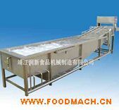 該機(jī)由機(jī)架、水箱、風(fēng)機(jī)、提升機(jī)、氣泡管、噴水管等幾部分組成,工作時由于水中風(fēng)力的存在,蔬果在水中任意方向翻滾轉(zhuǎn)動,并在高壓水力的推動下向前移動,在出口由一刮板提升機(jī),將果蔬送至下道工序。整體為分體式結(jié)構(gòu),水箱與輸送機(jī)、進(jìn)出料斗、罩板方便拆卸,易于清洗和檢修。