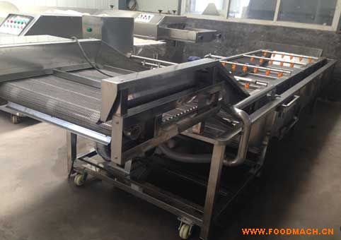 清洗機采用水浴式氣泡清洗,物料在水中通過氣泡在釋放過程中產(chǎn)生的翻騰效果,使物料在水中發(fā)生不規(guī)則的強烈翻轉(zhuǎn)運動,通過物料的運動有效分離被清洗物表面附著物,模擬人工清洗基本動作,同時由于物料是在汽水混合物中產(chǎn)生的翻騰運動,有效避免了清洗過程中產(chǎn)生的碰、磕、劃傷等對物料的損傷現(xiàn)象,提高了工作效率,變?nèi)斯ぷ鳂I(yè)為機械化加工。適合于各種新鮮水果、蔬菜、鹽漬菜、菌類、海產(chǎn)品。該清洗機在物料輸送過程中,增加了噴淋清洗功能,使物料在完成汽水浴清洗后,再經(jīng)過噴淋清洗,該道工序的作用是將物料表面的臟水替換去除,提高物料的清洗效果,同時,外來的清潔噴淋水在對物料進行二次清洗后,水自動流入水浴槽中,達(dá)到替換補充水浴槽內(nèi)的清洗水,保持了水浴槽內(nèi)水質(zhì)的清潔度,即提高了清洗水的利用率,又增加了清洗效果.