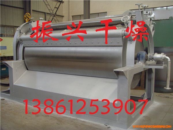 滾筒刮板干燥機(jī)是一種內(nèi)加熱傳導(dǎo)型轉(zhuǎn)動(dòng)連續(xù)干燥設(shè)備。旋轉(zhuǎn)的滾筒通過(guò)其下部料槽,粘附著一厚度的料膜,熱量通過(guò)管道輸送至滾筒內(nèi)壁,傳導(dǎo)到滾筒外壁,再傳導(dǎo)給料膜,使料膜中的濕度得到蒸發(fā)、脫濕、使含濕分的物料得到干燥。干燥好的物料被裝置在滾筒表面的刮刀鏟離滾筒,到置于刮刀下方的螺旋輸送器,通過(guò)螺旋輸送器將干物料集中、包裝。
