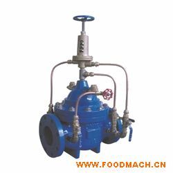 當(dāng)閥門從進(jìn)口端給水時(shí),水流過針閥進(jìn)入主閥控制室,并經(jīng)過導(dǎo)閥、球閥流出主閥控制室到出口,此時(shí)主閥處于全開或浮動(dòng)狀態(tài)。調(diào)定主閥上部的流量調(diào)節(jié)閥,可為主閥設(shè)定一定開度。調(diào)節(jié)針閥開度和調(diào)節(jié)導(dǎo)閥彈簧壓力,即可使主閥開度保持在設(shè)定開度,并在壓力變化時(shí)導(dǎo)閥進(jìn)行自動(dòng)調(diào)節(jié),保持流量不變。