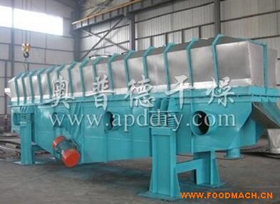 物料自進料進口進入機內,在振動力作用下,物料沿水平面流化床拋擲,向前連續(xù)運動,熱風向上穿過流化床同濕物料換熱后,濕空氣經旋風分離器除塵后由排風1:3排出.干燥物料由排料進口排出。