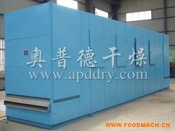 物料由加料器均勻地鋪在網(wǎng)帶上,網(wǎng)帶一般采用12-60目不銹鋼絲網(wǎng),由傳動裝置拖動在干燥機內(nèi)移動。干燥機由若干單元組成,每一單元熱風(fēng)獨立循環(huán),部分尾氣由專門排濕風(fēng)機排出,廢氣由調(diào)節(jié)閥控制,熱氣由下往上或由上往下穿過鋪滿物料的網(wǎng)帶完成熱量與質(zhì)量傳遞的進(jìn)程,帶走物料水份。網(wǎng)帶緩慢移動,運行速度可根據(jù)物料溫度自由調(diào)節(jié),干燥后的成品連續(xù)落入收料器中。上下循環(huán)單元根據(jù)用戶需要可靈活配備,單元數(shù)量亦可根據(jù)需要選取。
