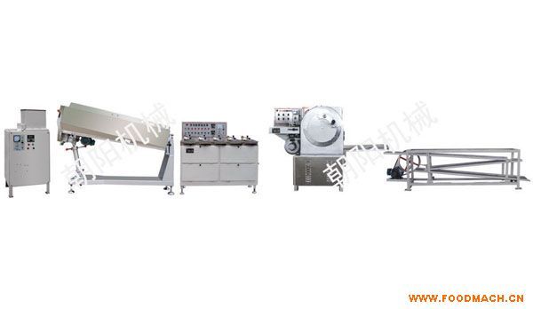 該機(jī)組是用來生產(chǎn)硬糖,夾芯硬糖的理想設(shè)備。其特點(diǎn):封閉模腔一次沖壓成形,糖塊體形標(biāo)準(zhǔn),表面光潔,且生產(chǎn)量大,無廢料。(注:中間環(huán)節(jié)增加勻條冷卻輸送機(jī)可生產(chǎn)奶糖)。