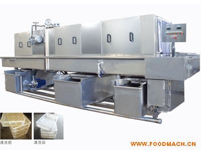 需清洗的周轉(zhuǎn)筐由不銹鋼鏈條輸入清洗機(jī)中,依次通過(guò)加溫老堿水→高壓熱水→常溫自來(lái)水→消毒水→常溫風(fēng)刀去水等多道工序,將筐子清洗干凈,同時(shí)完成殺菌及風(fēng)干;特殊筐子清洗時(shí)可在熱堿水清洗段后加配毛刷,對(duì)筐子底部及左右兩側(cè)進(jìn)行刷洗,提高清洗效果;采用連續(xù)式清洗,以提高清洗效率;
