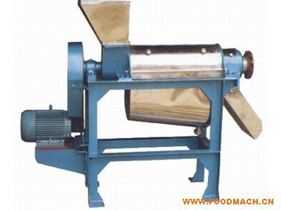 原料加入進料斗中,在螺旋的推進下受壓,其壓榨的汁液通過過濾網流入底部的盛汁器,而廢料則通過螺旋及調壓的錐形部分之間形成的環(huán)狀空隙排出,調壓頭沿軸向的移動可調整空隙的大小,調整出汁率。