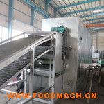 物料由加料器均勻地鋪在網(wǎng)帶上,網(wǎng)帶一般采用12-60目不銹鋼絲網(wǎng),由傳動(dòng)裝置拖動(dòng)在干燥機(jī)內(nèi)移動(dòng)。干燥機(jī)由若干單元組成,每一單元熱風(fēng)獨(dú)立循環(huán),部分尾氣由專門排濕風(fēng)機(jī)排出,廢氣由調(diào)節(jié)閥控制,熱氣由下往上或由上往下穿過(guò)鋪滿物料的網(wǎng)帶完成熱量與質(zhì)量傳遞的進(jìn)程,帶走物料水份。網(wǎng)帶緩慢移動(dòng),運(yùn)行速度可根據(jù)物料溫度自由調(diào)節(jié),干燥后的成品連續(xù)落入收料器中。上下循環(huán)單元根據(jù)用戶需要可靈活配備,單元數(shù)量亦可根據(jù)需要選取。