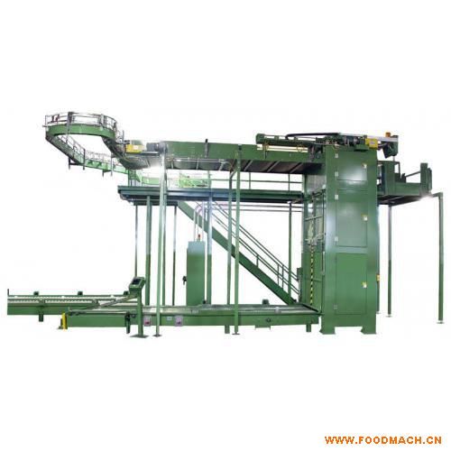 本機(jī)型主要應(yīng)用于馬口鐵罐及鋁罐的卸空罐作業(yè),將堆棧于棧板上的空罐,由上而下一層一層的推至網(wǎng)式輸送機(jī)上,再藉由輸送機(jī)傳送至空罐噴洗機(jī),取代人工排罐方式,節(jié)省人力。優(yōu)異的性能:1.取代人工排罐及傳統(tǒng)式空罐卸罐機(jī),可節(jié)省大量人工,提高生產(chǎn)能力。 2.采用可程序計(jì)算機(jī)控制系統(tǒng),提高機(jī)械動(dòng)作的準(zhǔn)確性,且操作容易。 3.棧板升降臺(tái)自鎖式升降、棧板疊板機(jī)采用氣缸升降,動(dòng)作穩(wěn)定。 4.推罐方式可選擇連續(xù)動(dòng)作或單一循環(huán)動(dòng)作,操作適應(yīng)性高。 5.適用各種尺寸大小的馬口鐵罐及鋁罐的卸空罐作業(yè)。 完善的配置機(jī)構(gòu) 1.棧板輸送機(jī)叉車運(yùn)送迭滿空罐的棧板,置于棧板輸送機(jī)上,然后輸送機(jī)再將之輸送至主機(jī)的棧板升降臺(tái)上;棧板輸送機(jī)的傳動(dòng)馬達(dá)由變頻器控制,運(yùn)送時(shí)由停止?fàn)顟B(tài)慢慢加速啟動(dòng),可避免突然啟動(dòng)使空罐傾倒的危險(xiǎn) 。2.棧板定位裝置利用杠桿原理及微動(dòng)開(kāi)關(guān)組成的定位裝置,感測(cè)空罐棧暹M(jìn)入主機(jī)棧板升降臺(tái)的正確位置,及卸完空罐后棧板下降時(shí)的定位 。3.棧板升降臺(tái)棧板升降臺(tái)是將定位后的空罐棧板升送至卸罐高度,當(dāng)卸完空罐后,再將空棧板降下置于輸送機(jī)上;所有上升下降的動(dòng)作全部由自鎖式升降系統(tǒng)裝置控制,并能單獨(dú)調(diào)整上升或下降的速度,以配合操作上的需要 。4.卸空罐裝置利用氣壓缸或油壓馬達(dá)帶動(dòng)推罐裝置,將整層的空罐推至網(wǎng)式輸送機(jī)上,然后回歸至準(zhǔn)備位置,繼續(xù)將下一層推出;全部動(dòng)作定位由光電開(kāi)關(guān)控制,而且能選擇連續(xù)動(dòng)作或單一循環(huán)方式卸罐 。5. 空棧板堆積臺(tái)疊板機(jī)構(gòu)卸完空罐后的空棧板,藉由空棧板輸送機(jī)移送至空棧板椎積臺(tái),然后依序堆棧至一定高度時(shí),再用叉車將棧板移出。 主要技術(shù)參數(shù) 可卸尺寸高度2300mm,適用托盤1100mmx1400mm;生產(chǎn)能力500-1200罐分鐘;PLC可編程電腦自動(dòng)控制器、光電開(kāi)關(guān)、行程開(kāi)關(guān)、氣動(dòng)控制等均采用德國(guó)、日本、臺(tái)灣等*品牌產(chǎn)品;適用物體尺寸:直徑50mm~直徑153mm,高50mm-高270mm;適用物體:各種金屬罐、塑料瓶、玻璃瓶等;外形尺寸 :長(zhǎng)10500mmx寬3000mmx高3500mm;動(dòng)力參數(shù):3x380V 7kW;使用壓縮空氣:0.6Mpa ,0.1L/min。