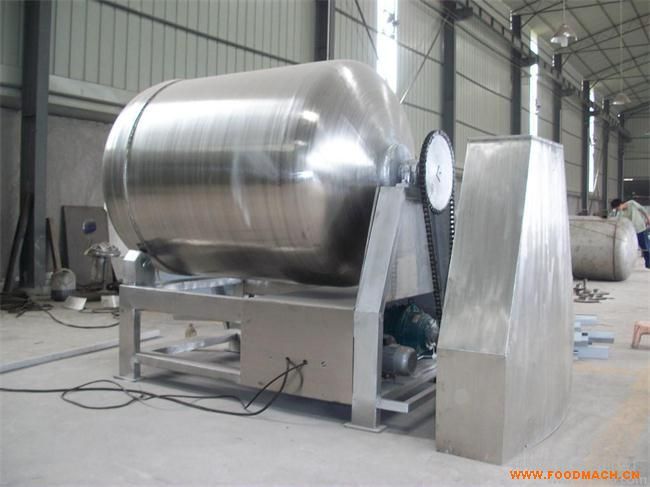 真空滾揉機,真空腌制機,呼吸式真空滾揉機是通過內(nèi)部帶有傾斜漿葉的滾筒帶動桶內(nèi)原料運動,從而對原料進(jìn)行拍打,使原料入味。真空滾揉機利用真空泵,將滾筒內(nèi)抽成真空狀態(tài),這樣肉制品細(xì)胞會由于壓強差異,在細(xì)胞膜內(nèi)外產(chǎn)生滲透壓,細(xì)胞就會如同呼吸一樣,自動吸取腌漬液。真空腌制機可以減少產(chǎn)品的腌制時間,縮短了產(chǎn)品的生產(chǎn)周期。