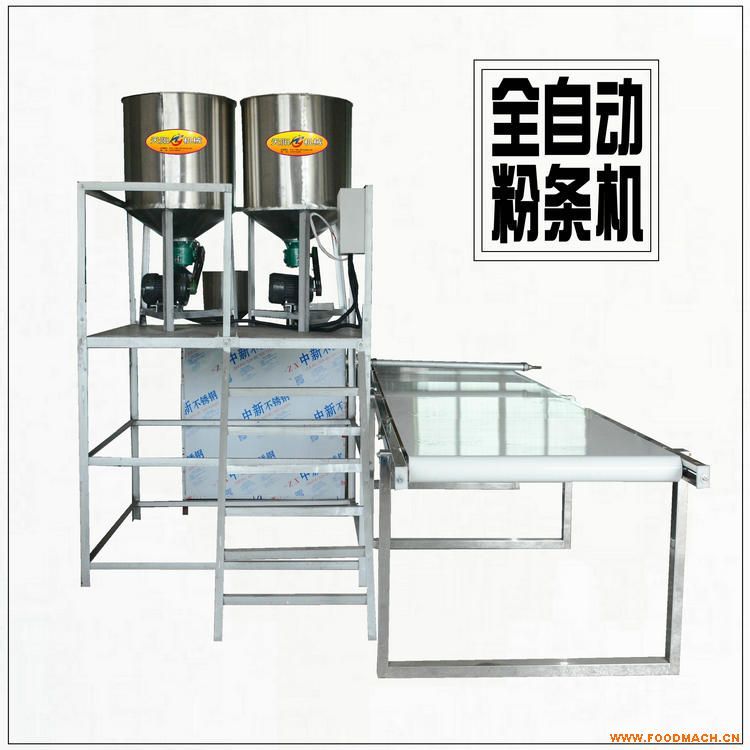 全自動不粘連粉條機型號:6FT-140BN,由粉條成型機和皮帶輸送接條機組成,生產(chǎn)效率:150-180公斤/小時,加熱器功率12KW,主電機7.5-11KW,輸送機0.4KW(調(diào)速),外形尺寸:4600*2200*1250mm,價格:普鋼主機12300元/套,不銹鋼主機14000元(不含運費)。