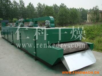 物料由加料器均勻地鋪在網(wǎng)帶上,網(wǎng)帶一般采用12-60目不銹鋼絲網(wǎng),由傳動裝置拖動在干燥機內(nèi)移動。干燥機由若干單元組成,每一單元熱風(fēng)獨立循環(huán),部分尾氣由專門排濕風(fēng)機排出,廢氣由調(diào)節(jié)閥控制,熱氣由下往上或由上往下穿過鋪滿物料的網(wǎng)帶完成熱量與質(zhì)量傳遞的進程,帶走物料水份。網(wǎng)帶緩慢移動,運行速度可根據(jù)物料溫度自由調(diào)節(jié),干燥后的成品連續(xù)落入收料器中。上下循環(huán)單元根據(jù)用戶需要可靈活配備,單元數(shù)量亦可根據(jù)需要選取。