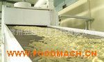 物料由加料器均勻地鋪在網(wǎng)帶上,網(wǎng)帶一般采用12-60目不銹鋼絲網(wǎng),由傳動裝置拖動在干燥機(jī)內(nèi)移動。干燥機(jī)由若干單元組成,每一單元熱風(fēng)獨立循環(huán),部分尾氣由專門排濕風(fēng)機(jī)排出,廢氣由調(diào)節(jié)閥控制,熱氣由下往上或由上往下穿過鋪滿物料的網(wǎng)帶完成熱量與質(zhì)量傳遞的進(jìn)程,帶走物料水份。網(wǎng)帶緩慢移動,運(yùn)行速度可根據(jù)物料溫度自由調(diào)節(jié),干燥后的成品連續(xù)落入收料器中。上下循環(huán)單元根據(jù)用戶需要可靈活配備,單元數(shù)量亦可根據(jù)需要選取。