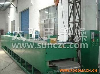 物料由加料器均勻地鋪在網(wǎng)帶上,網(wǎng)帶一般采用12-60目不銹鋼絲網(wǎng),由傳動裝置拖動在干燥機(jī)內(nèi)移動。干燥機(jī)由若干單元組成,每一單元熱風(fēng)獨(dú)立循環(huán),部分尾氣由專門排濕風(fēng)機(jī)排出,廢氣由調(diào)節(jié)閥控制,熱氣由下往上或由上往下穿過鋪滿物料的網(wǎng)帶完成熱量與質(zhì)量傳遞的進(jìn)程,帶走物料水份。網(wǎng)帶緩慢移動,運(yùn)行速度可根據(jù)物料溫度自由調(diào)節(jié),干燥后的成品連續(xù)落入收料器中。上下循環(huán)單元根據(jù)用戶需要可靈活配備,單元數(shù)量亦可根據(jù)需要選取。